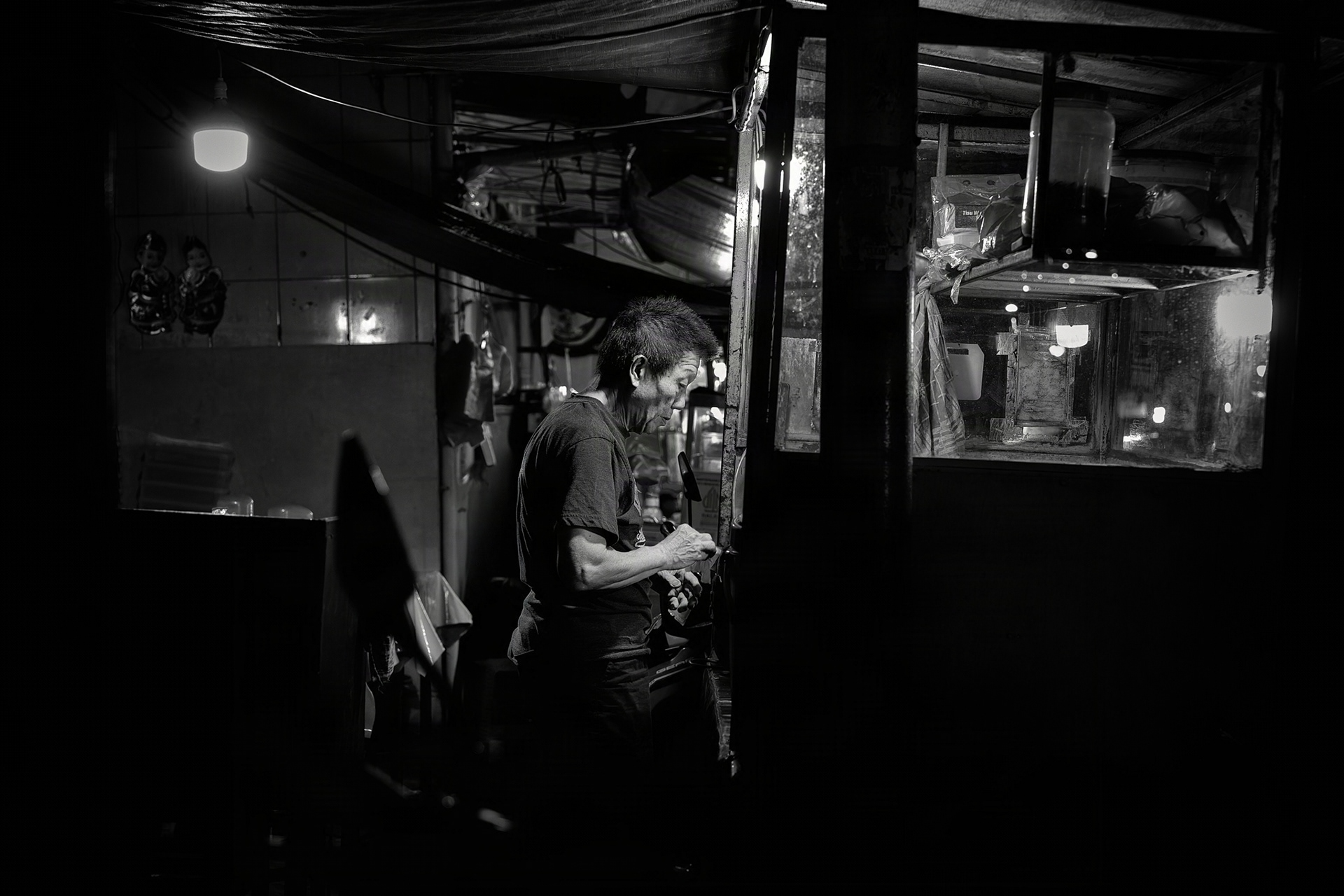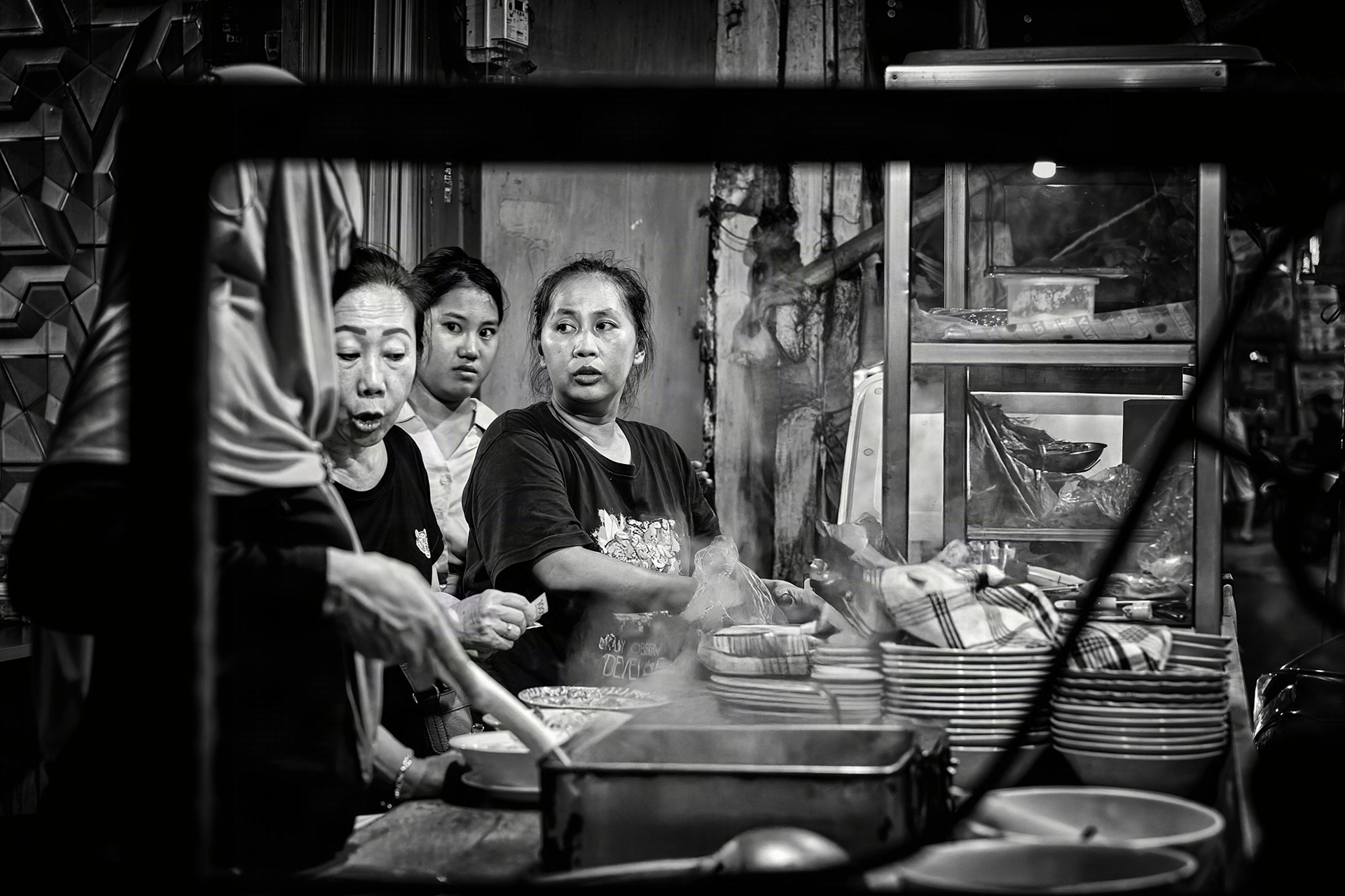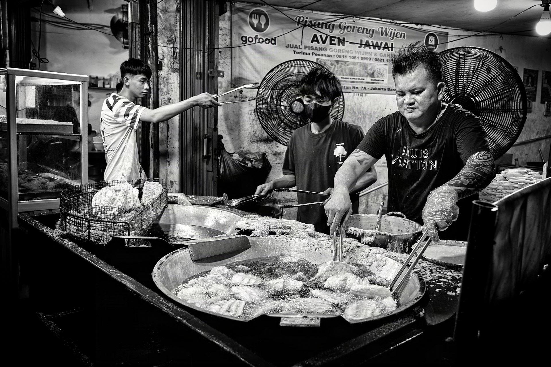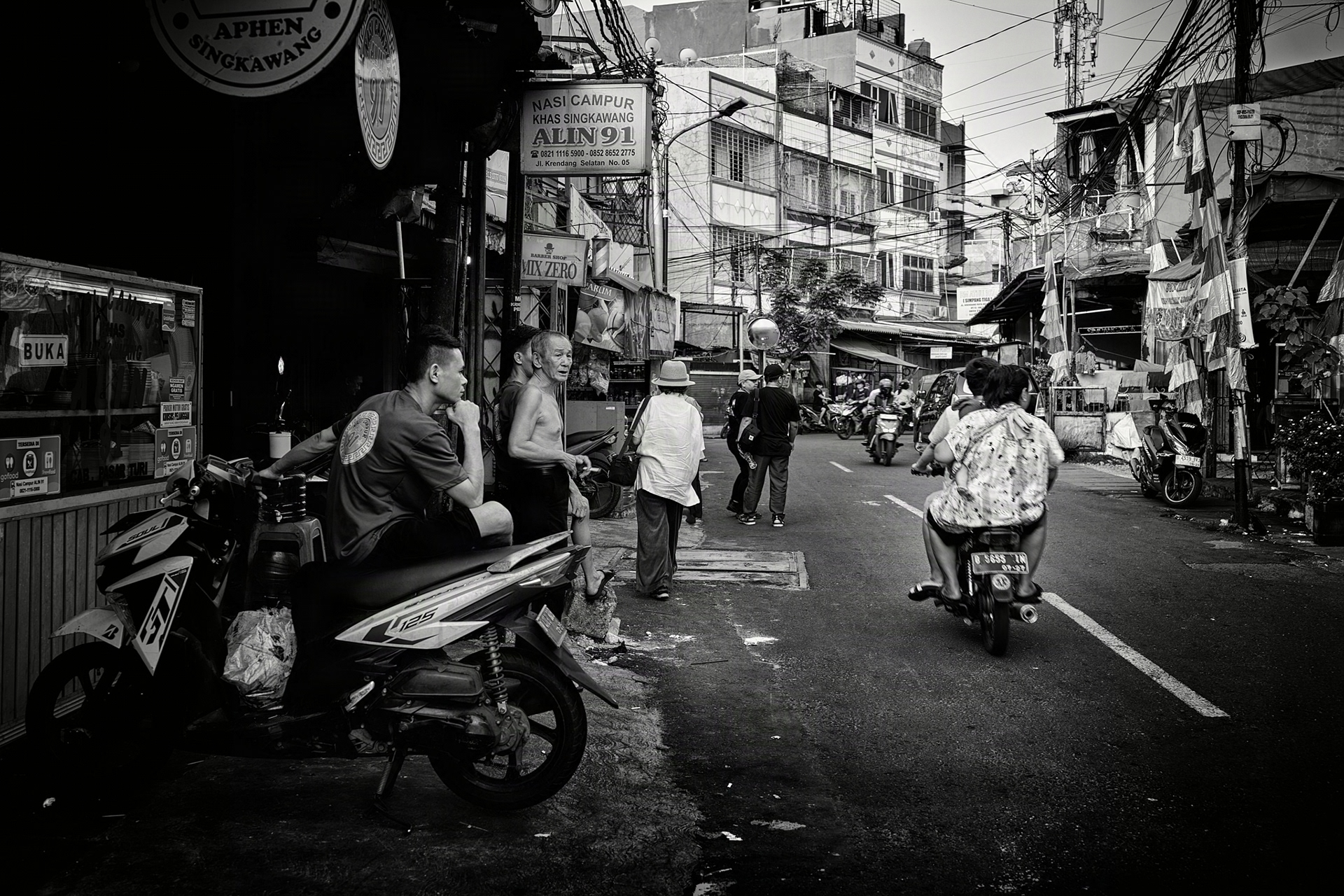 Krendang Afterhours — Street Food & Everyday Life A monochrome study of Krendang, Tambora—where tangled cables frame narrow streets, scooters weave past shopfronts, and food vendors shape the rhythm of the night. Shot from dusk to evening to catch hard light, steam, and texture.
